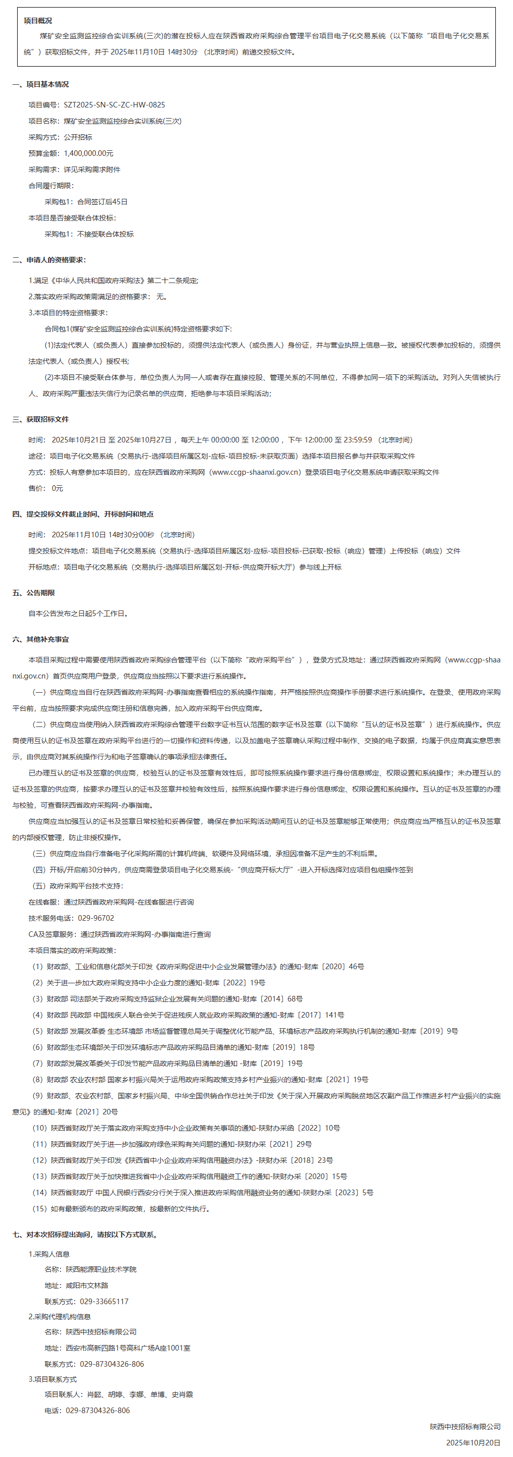 陕西能源职业技术学院煤矿安全监测监控综合实训系统(三次)招标公告