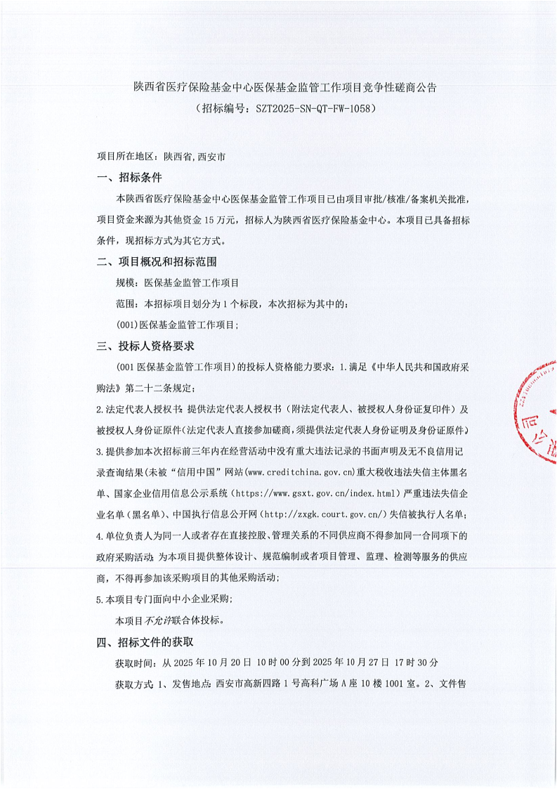 陕西省医疗保险基金中心医保基金监管工作项目竞争性磋商公告