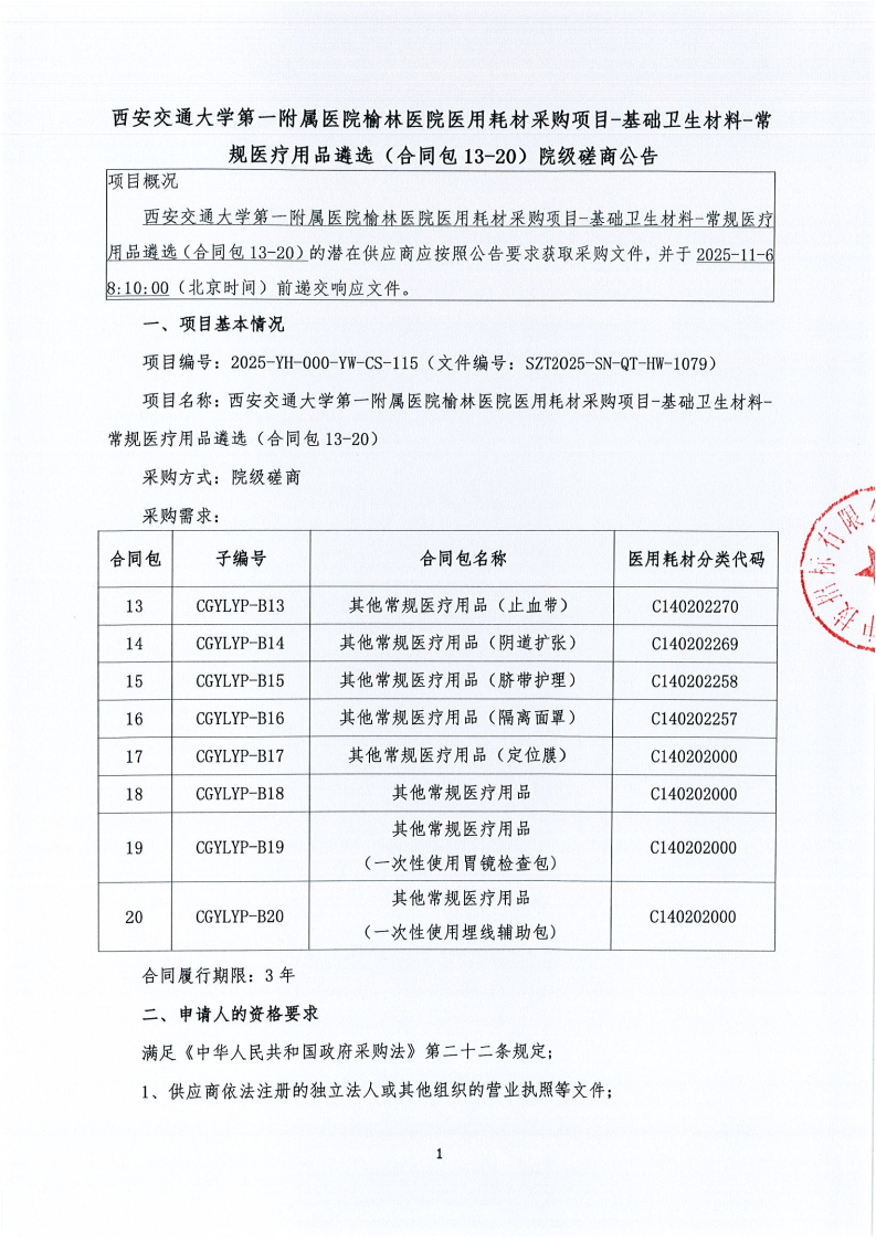 西安交通大学第一附属医院榆林医院医用耗材采购项目-基础卫生材料-常规医疗用品遴选(合同包13-20)院级磋商公告