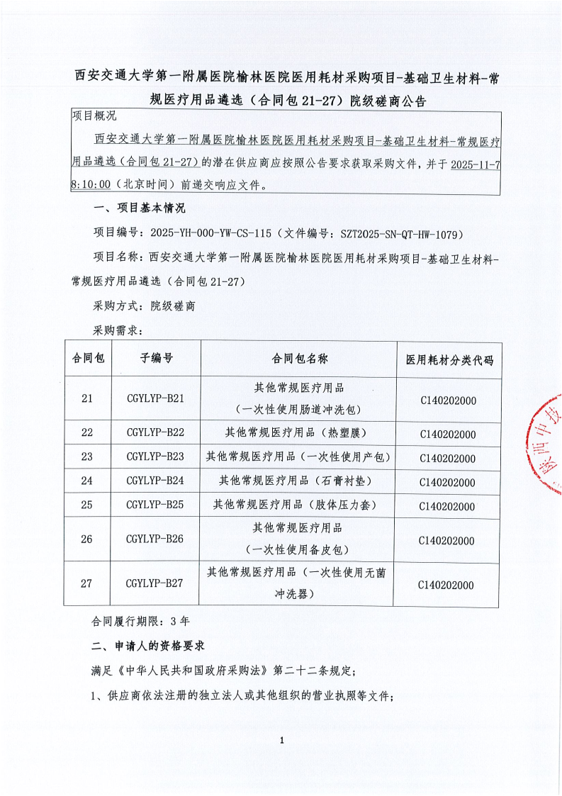 西安交通大学第一附属医院榆林医院医用耗材采购项目-基础卫生材料-常规医疗用品遴选(合同包21-27)院级磋商公告