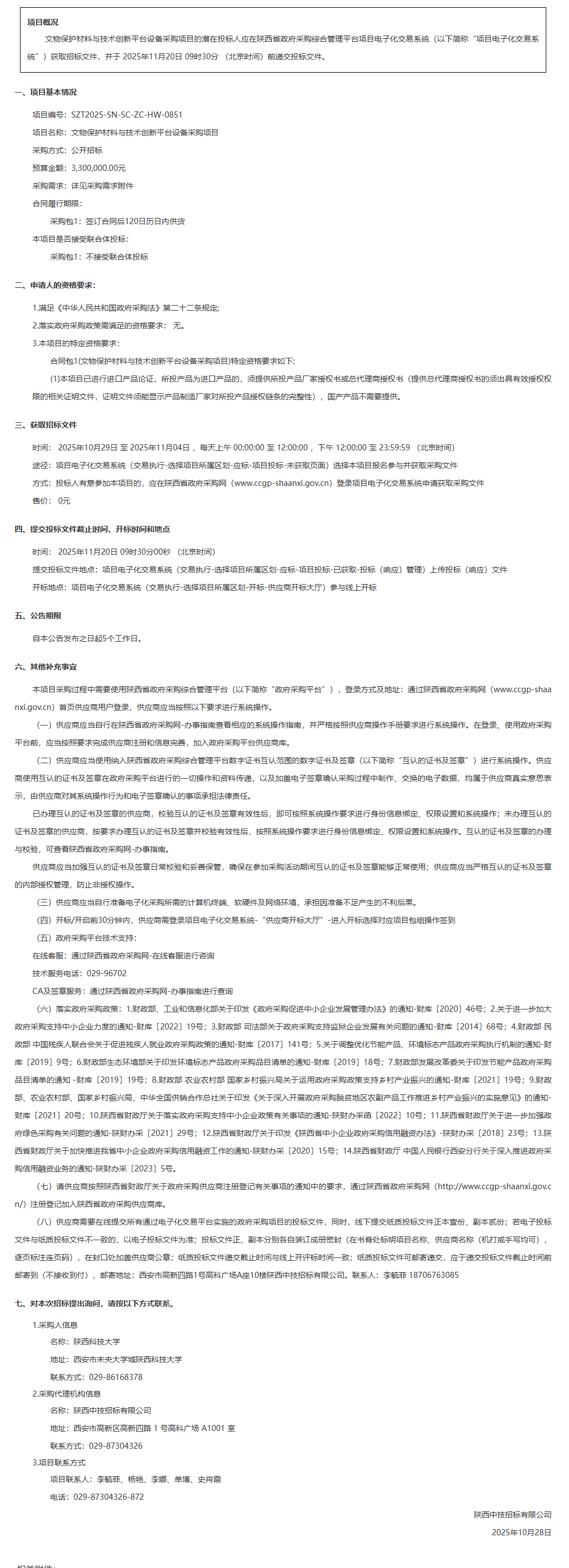 陕西科技大学文物保护材料与技术创新平台设备采购项目招标公告