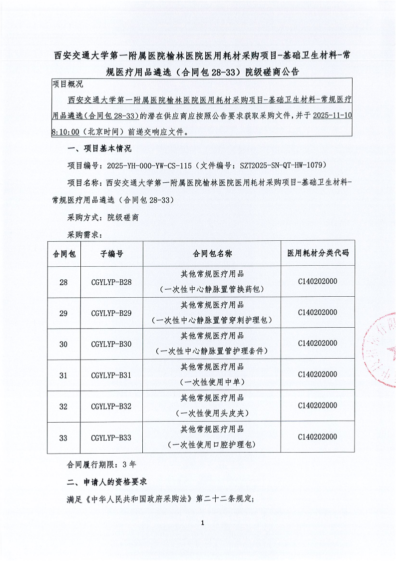 西安交通大学第一附属医院榆林医院医用耗材采购项目-基础卫生材料-常规医疗用品遴选(合同包28-33)院级磋商公告