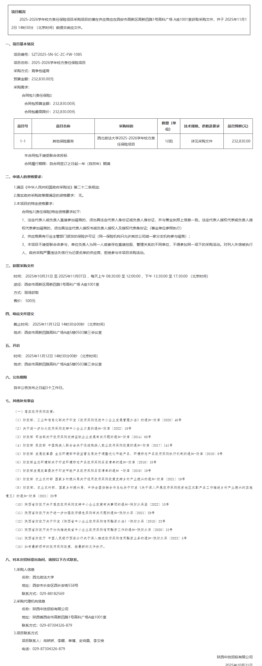 西北政法大学2025-2026学年校方责任保险项目竞争性磋商公告