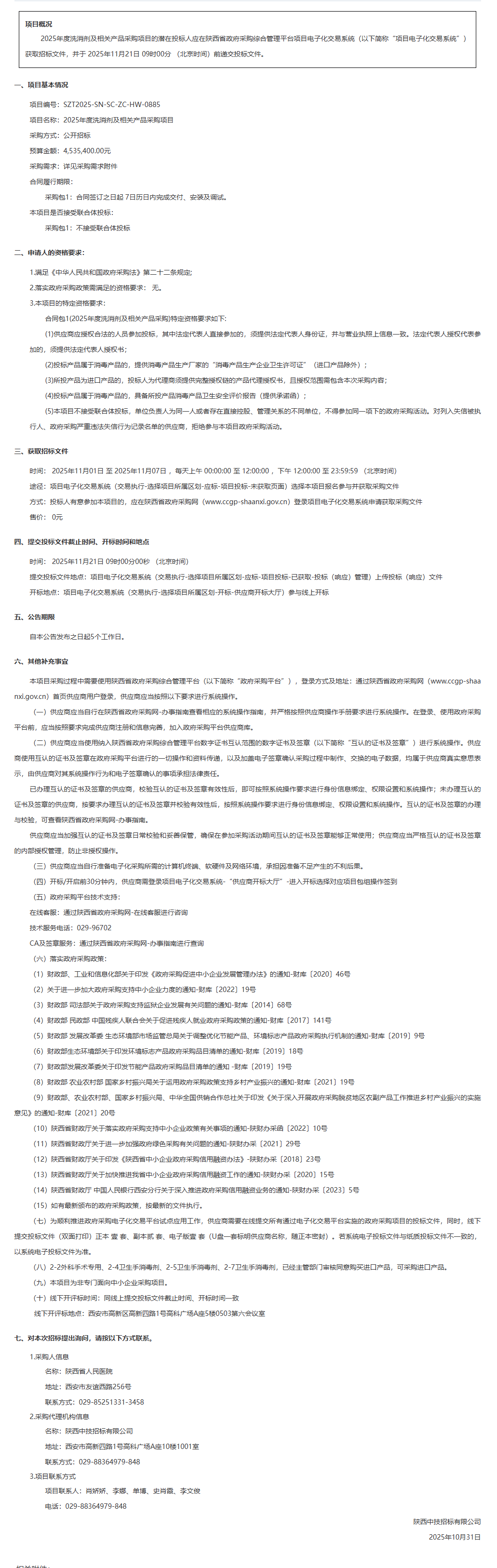 陕西省人民医院2025年度洗消剂及相关产品采购项目招标公告