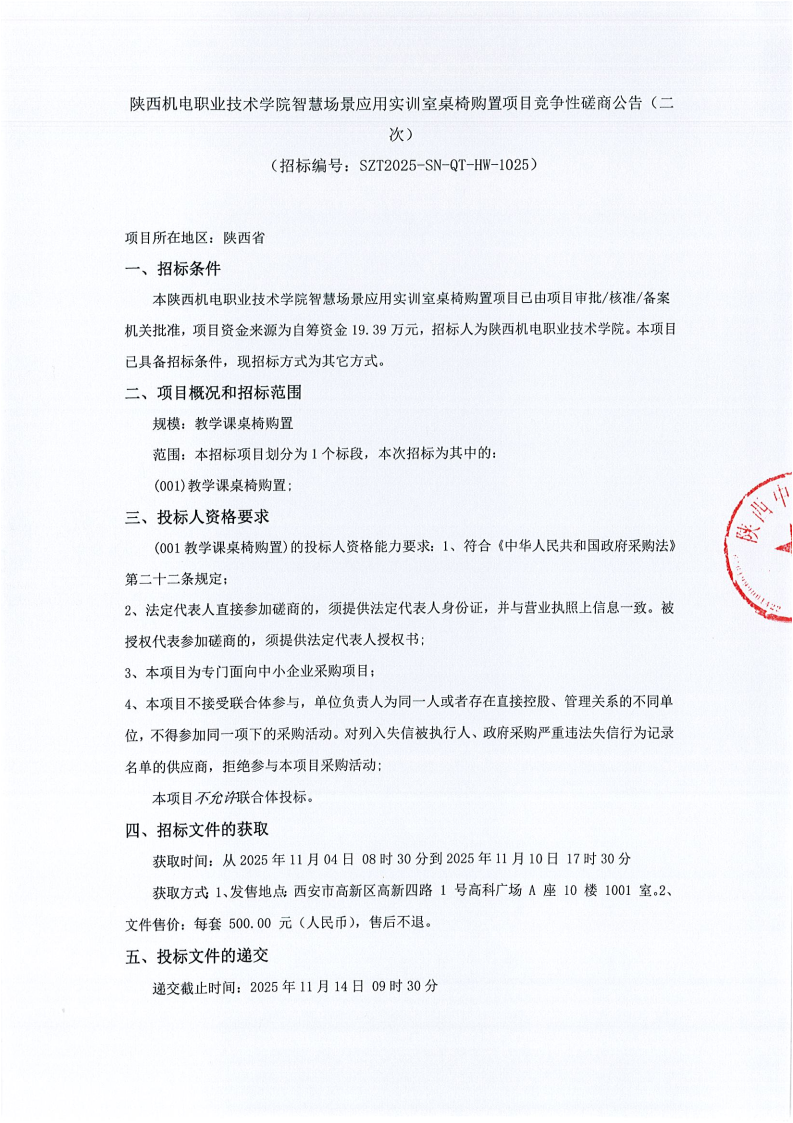 陕西机电职业技术学院智慧场景应用实训室桌椅购置项目竞争性磋商公告(二次)