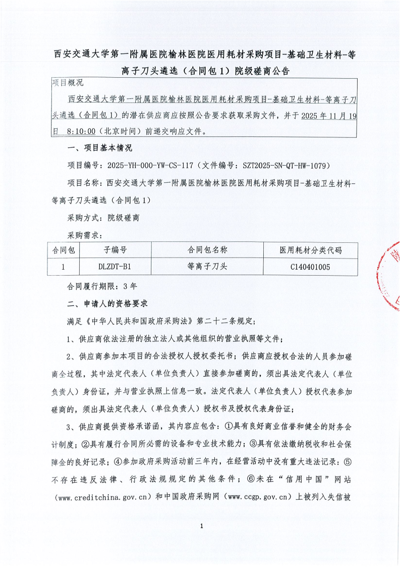 西安交通大学第一附属医院榆林医院医用耗材采购项目-基础卫生材料-等离子刀头遴选(合同包1)院级磋商公告