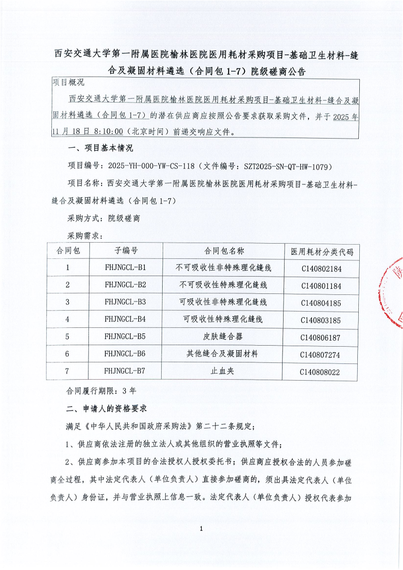 西安交通大学第一附属医院榆林医院医用耗材采购项目-基础卫生材料-缝合及凝固材料遴选(合同包1-7)院级磋商公告