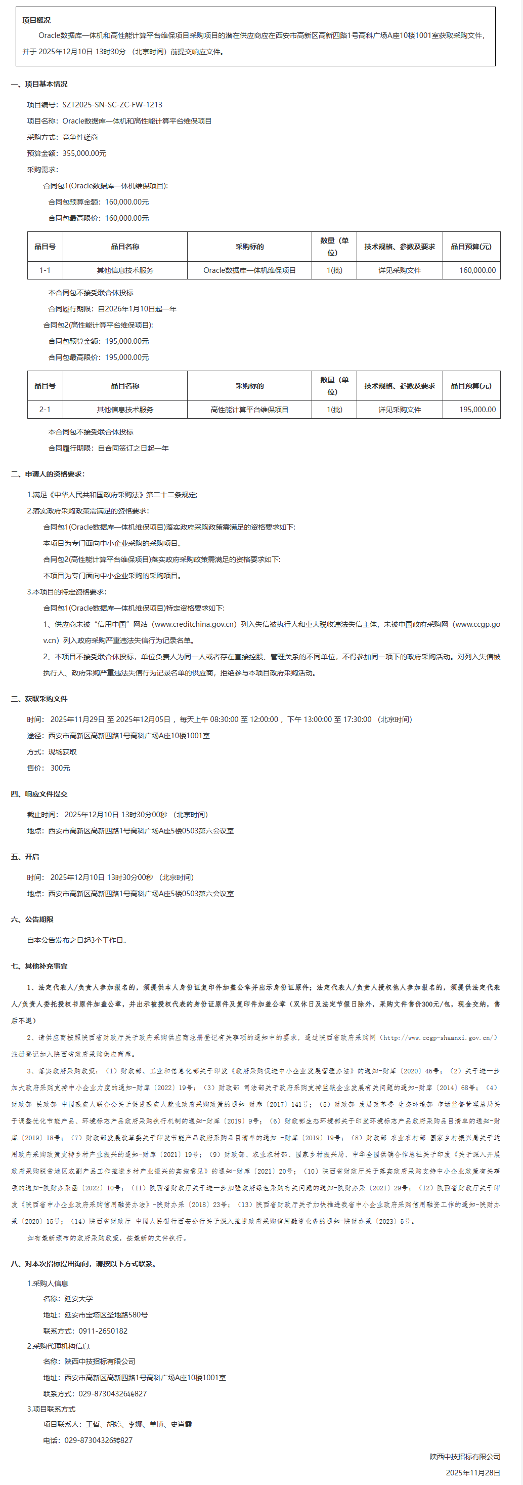延安大学Oracle数据库一体机和高性能计算平台维保项目竞争性磋商公告