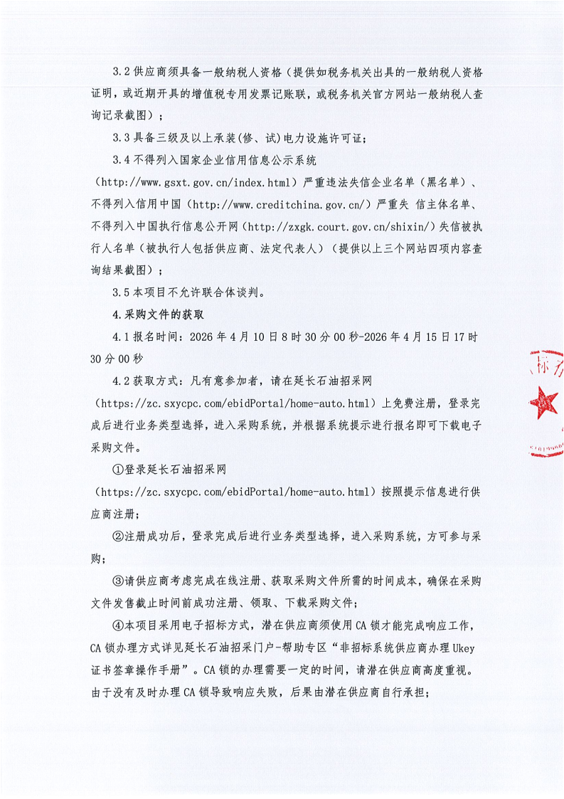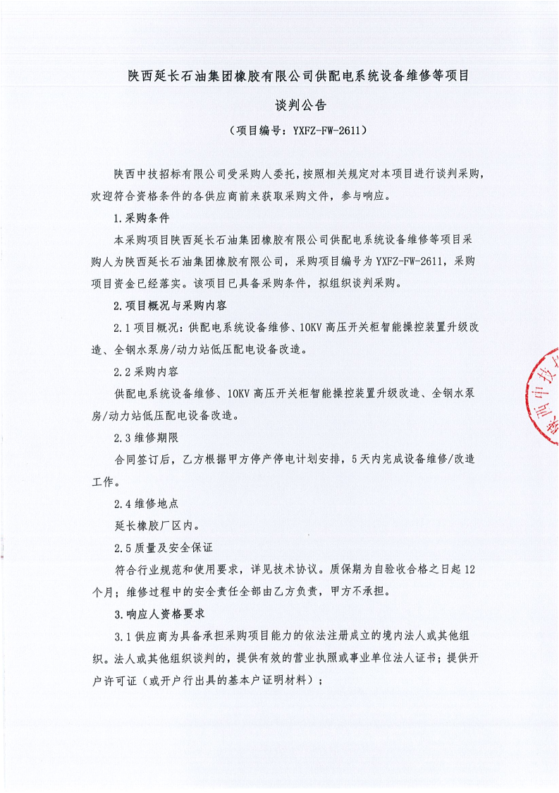 陕西延长石油集团橡胶有限公司供配电系统设备维修等项目谈判公告