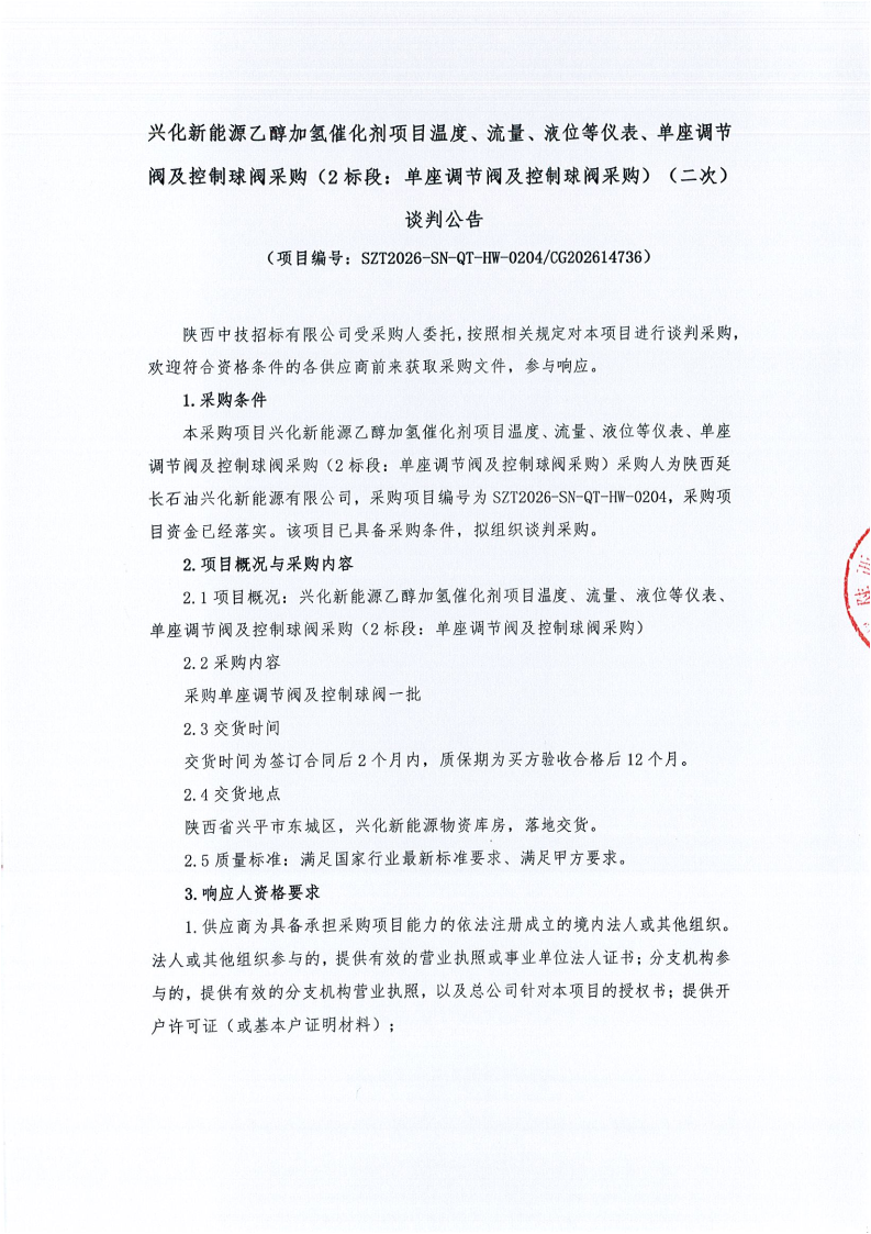 兴化新能源乙醇加氢催化剂项目温度、流量、液位等仪表、单座调节阀及控制球阀采购(2标段:单座调节阀及控制球阀采购)(二次)谈判公告
