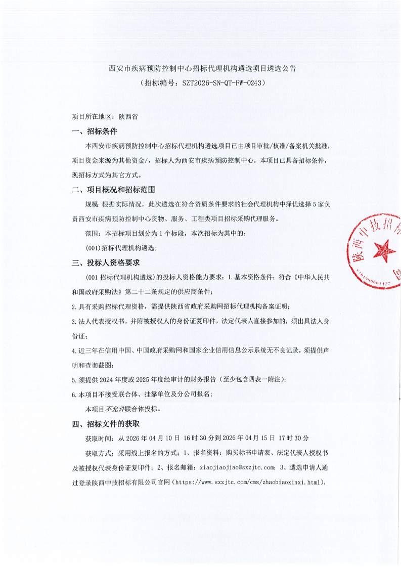 西安市疾病预防控制中心招标代理机构遴选项目遴选公告