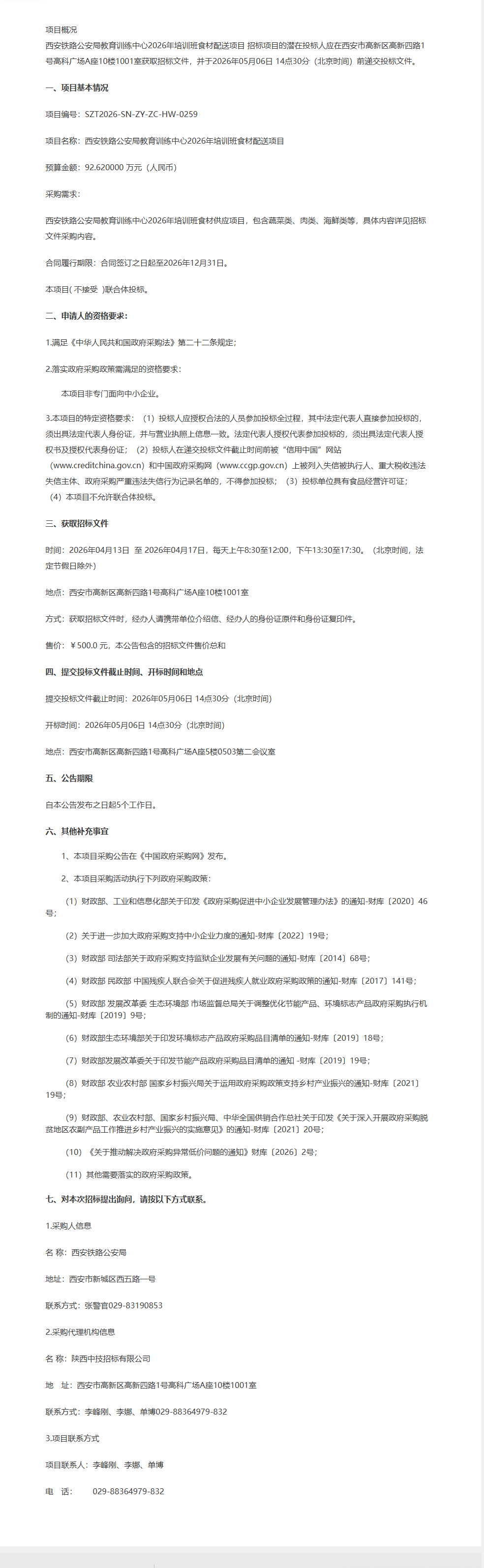 西安铁路公安局教育训练中心2026年培训班食材配送项目公开招标公告