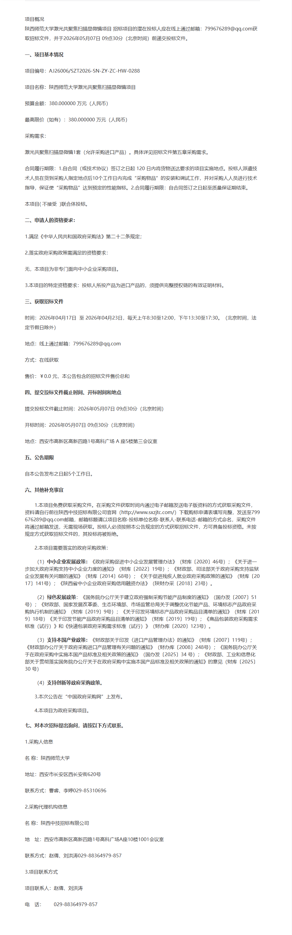 陕西师范大学激光共聚焦扫描显微镜项目公开招标公告