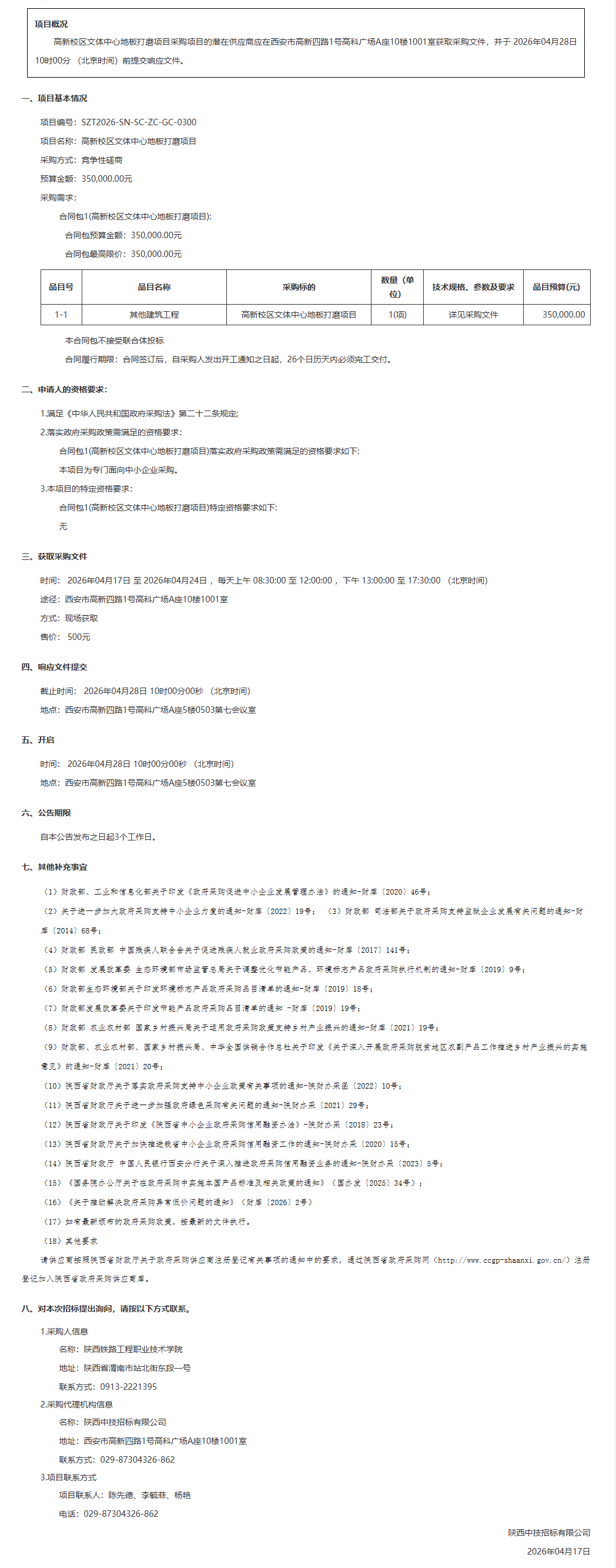 陕西铁路工程职业技术学院高新校区文体中心地板打磨项目竞争性磋商公告