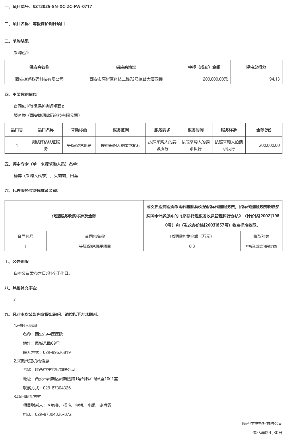 西安市中医医院等级保护测评项目中标(成交)结果公告