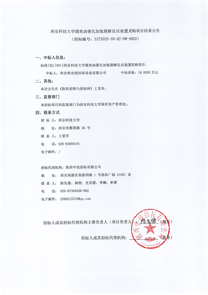 西安科技大学煤焦油催化加氢裂解反应装置采购项目结果公告