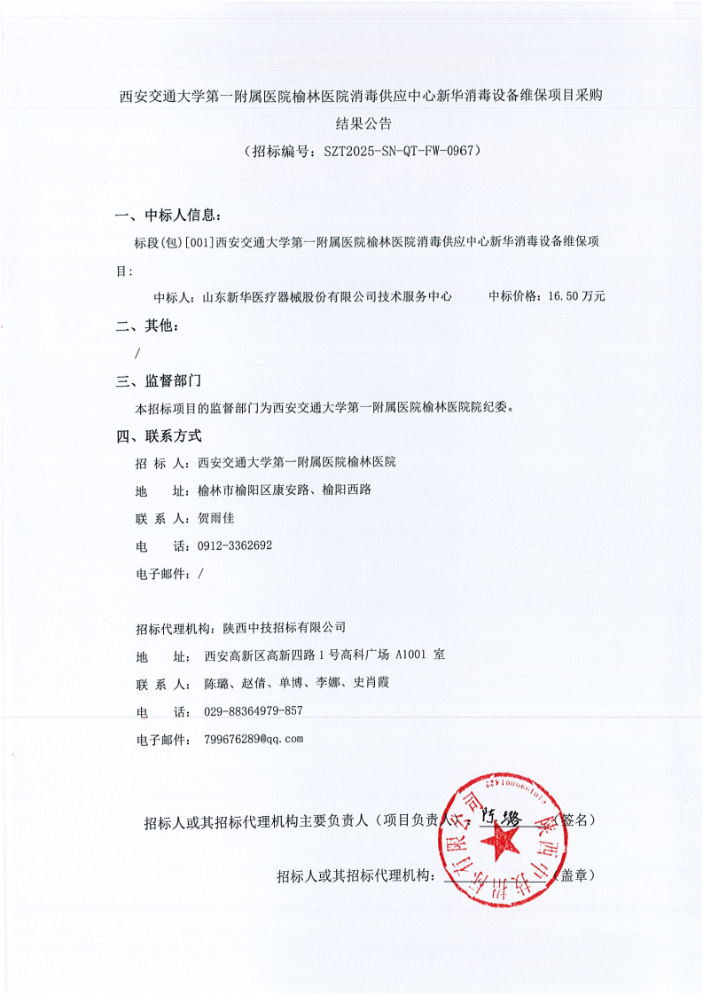 西安交通大学第一附属医院榆林医院消毒供应中心新华消毒设备维保项目采购结果公告