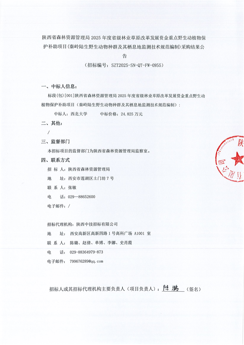 陕西省森林资源管理局2025年度省级林业草原改革发展资金重点野生动植物保护补助项目(秦岭陆生野生动物种群及其栖息地监测技术规范编制)采购结果公告