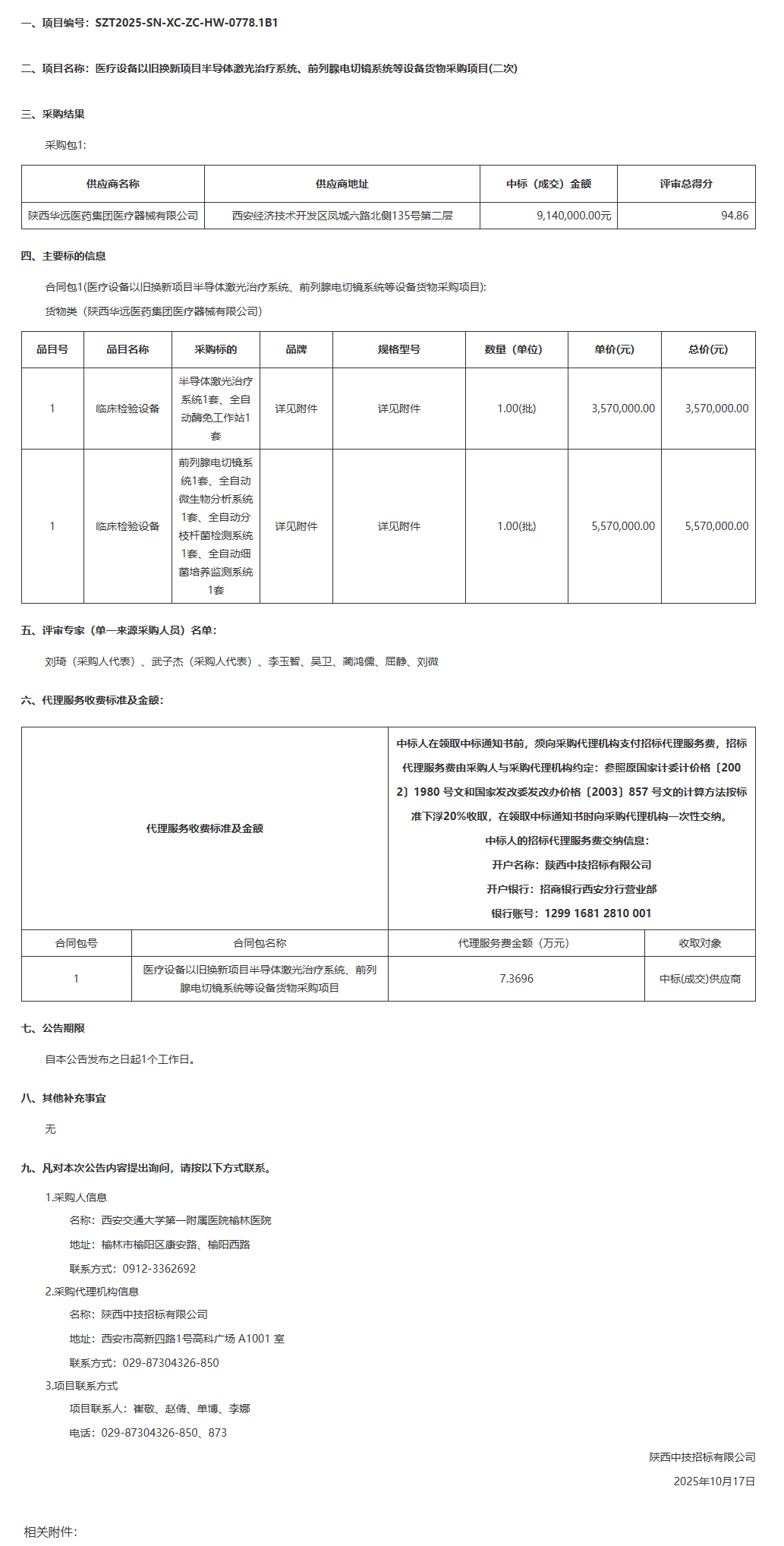 西安交通大学第一附属医院榆林医院医疗设备以旧换新项目半导体激光治疗系统、前列腺电切镜系统等设备货物采购项目(二次)中标(成交)结果公告