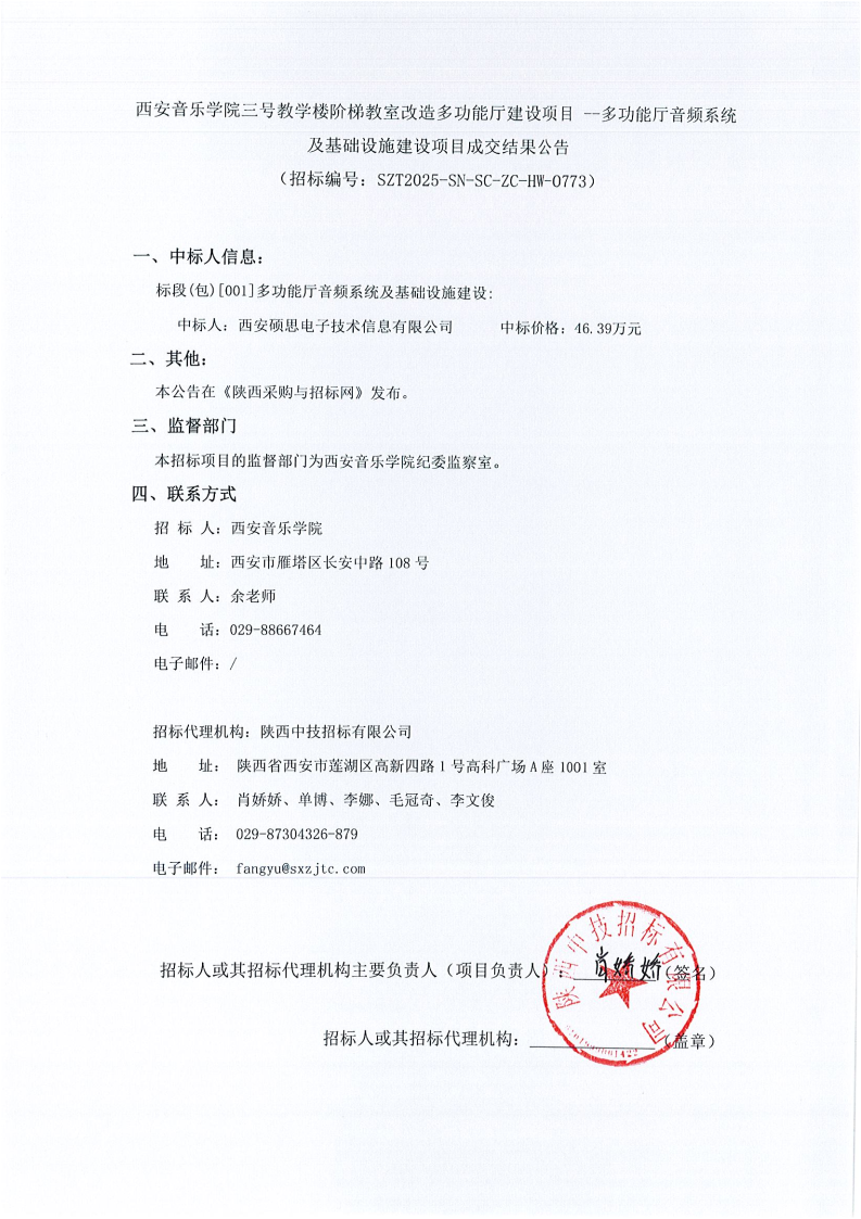 西安音乐学院三号教学楼阶梯教室改造多功能厅建设项目 --多功能厅音频系统及基础设施建设项目成交结果公告