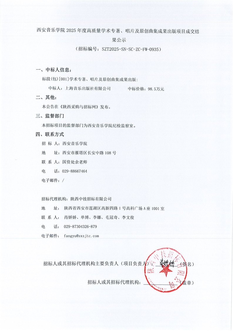 西安音乐学院2025年度高质量学术专著、唱片及原创曲集成果出版项目成交结果公示