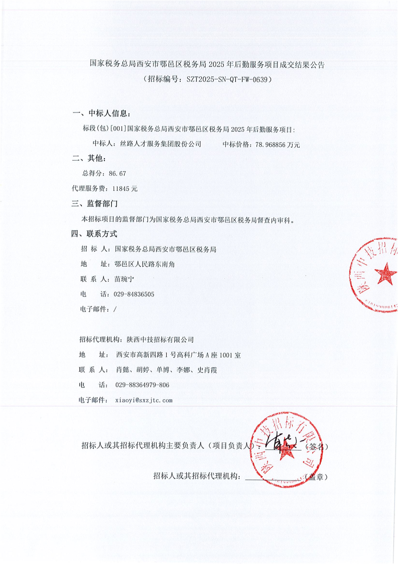 国家税务总局西安市鄠邑区税务局2025年后勤服务项目成交结果公告