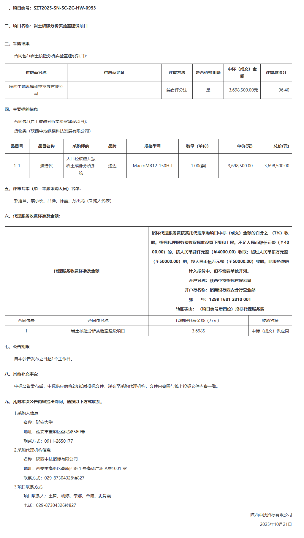延安大学岩土核磁分析实验室建设项目中标(成交)结果公告