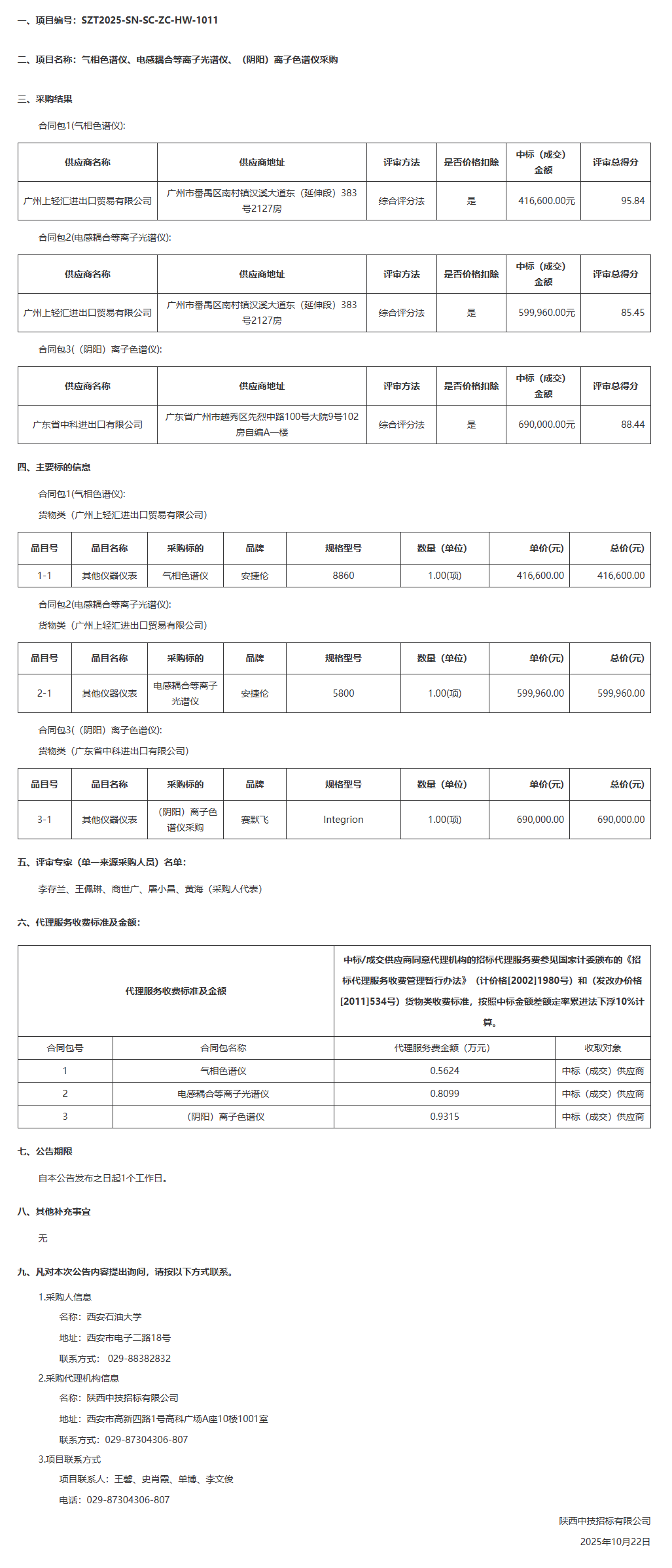 西安石油大学气相色谱仪、电感耦合等离子光谱仪、(阴阳)离子色谱仪采购中标(成交)结果公告