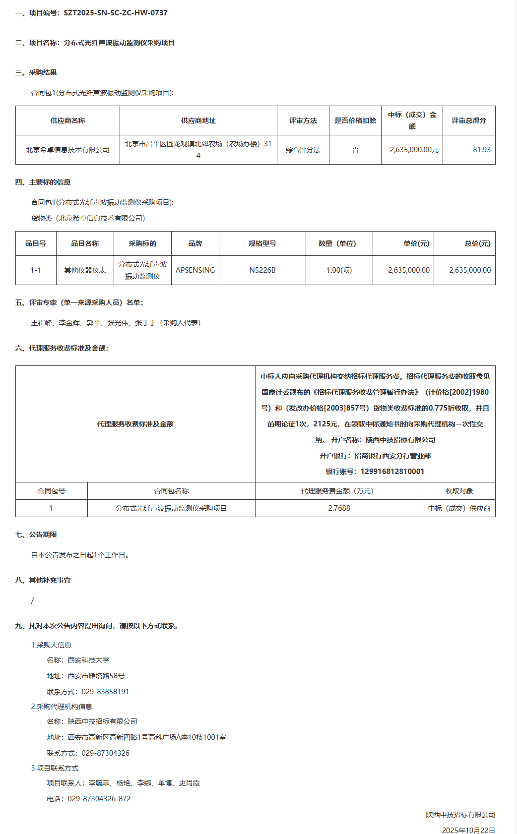 西安科技大学分布式光纤声波振动监测仪采购项目中标(成交)结果公告