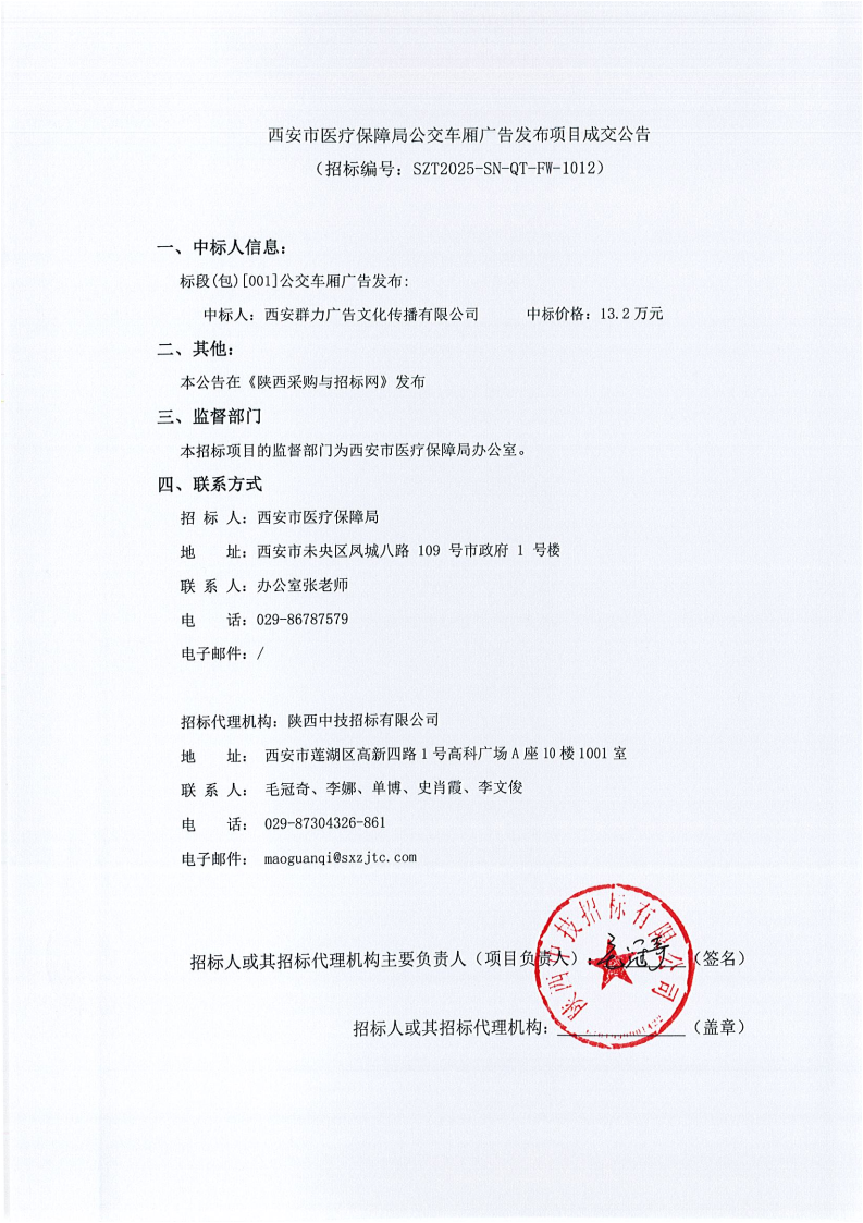 西安市医疗保障局公交车厢广告发布项目成交公告