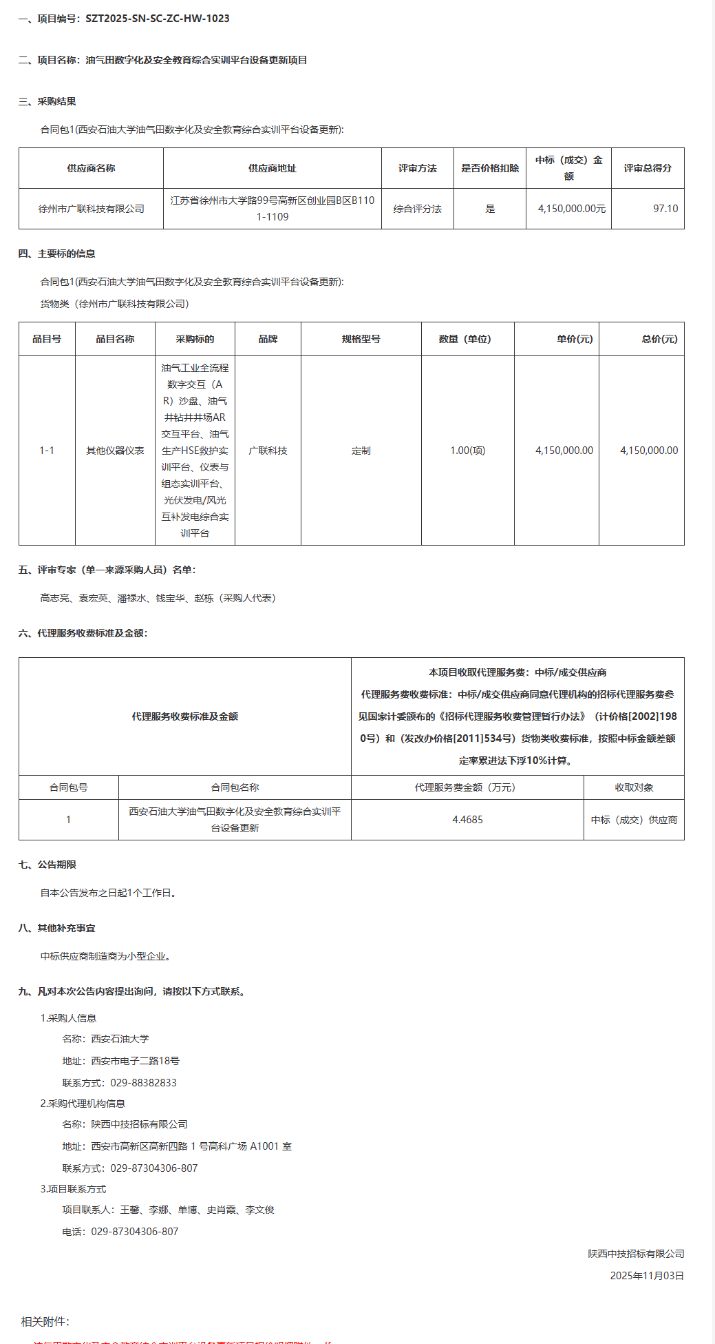 西安石油大学油气田数字化及安全教育综合实训平台设备更新项目中标(成交)结果公告