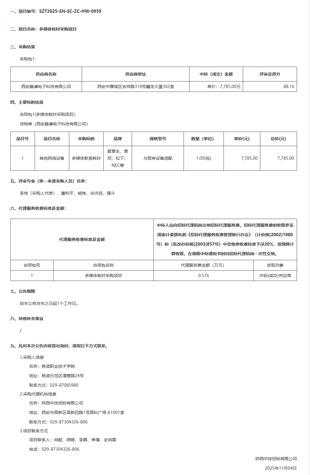 杨凌职业技术学院多媒体耗材采购项目中标(成交)结果公告