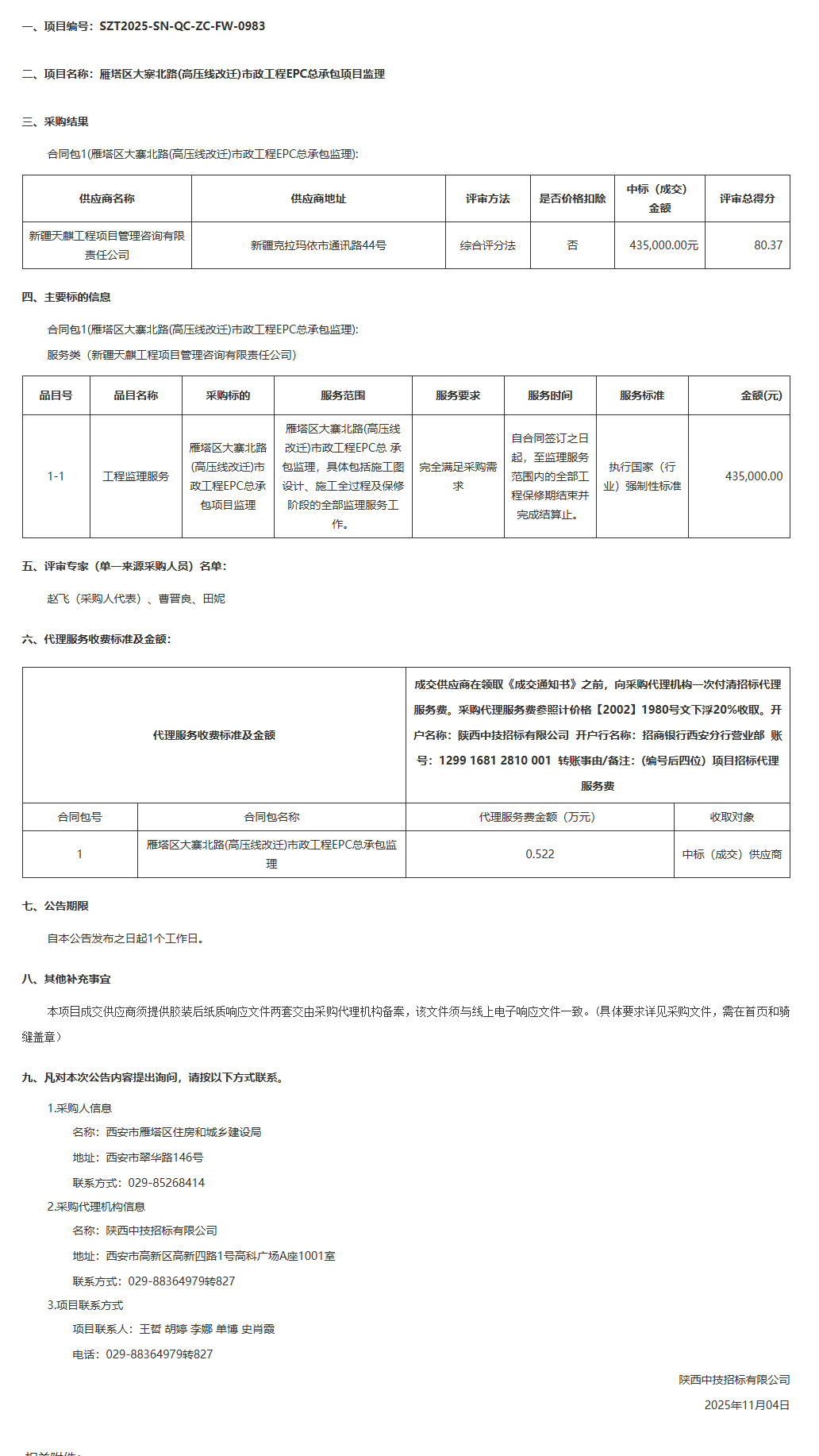 西安市雁塔区住房和城乡建设局雁塔区大寨北路(高压线改迁)市政工程EPC总承包项目监理中标(成交)结果公告