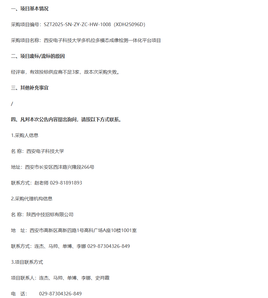 西安电子科技大学多机位多模态成像检测一体化平台项目废标公告