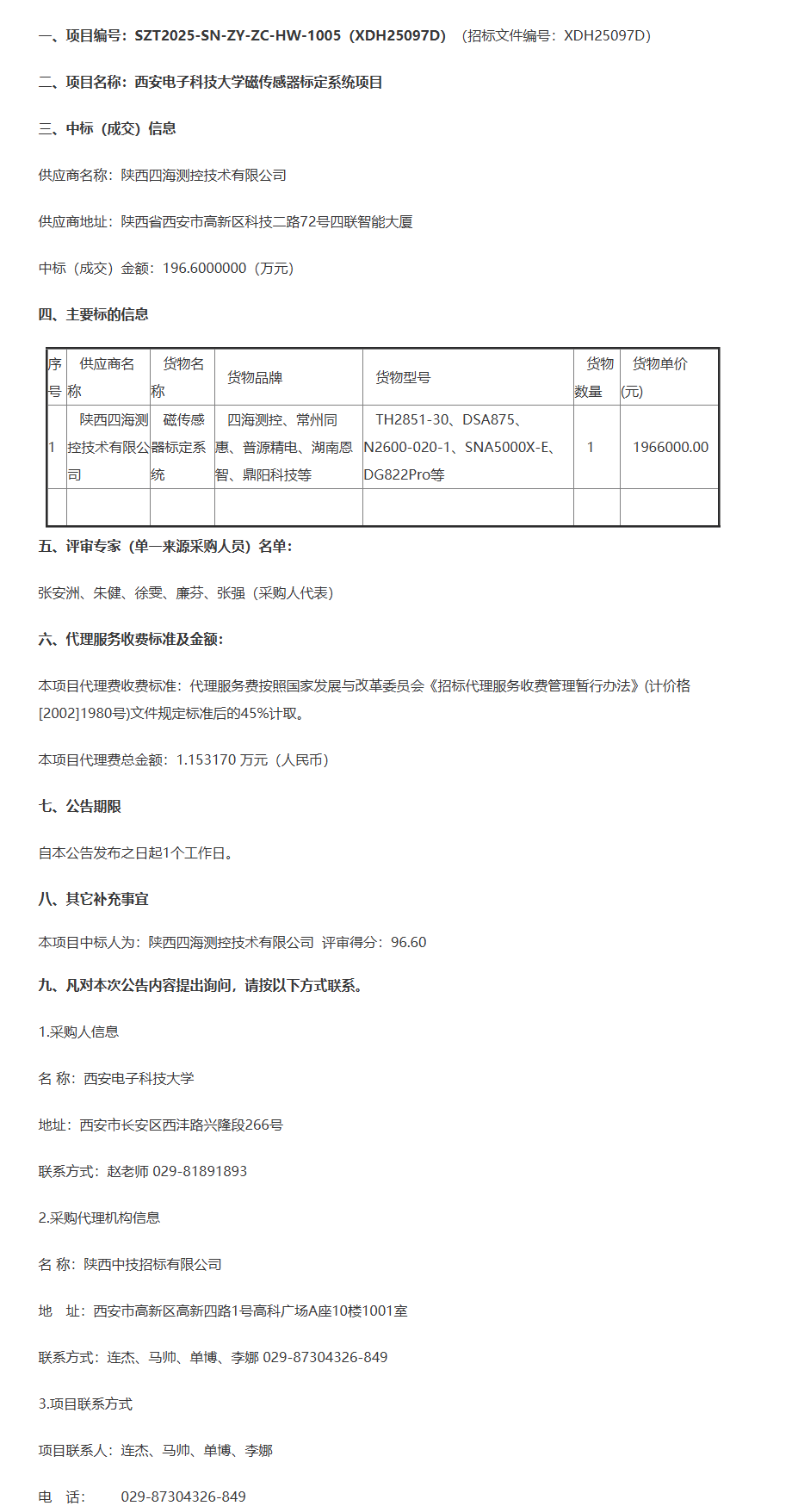 西安电子科技大学磁传感器标定系统项目中标公