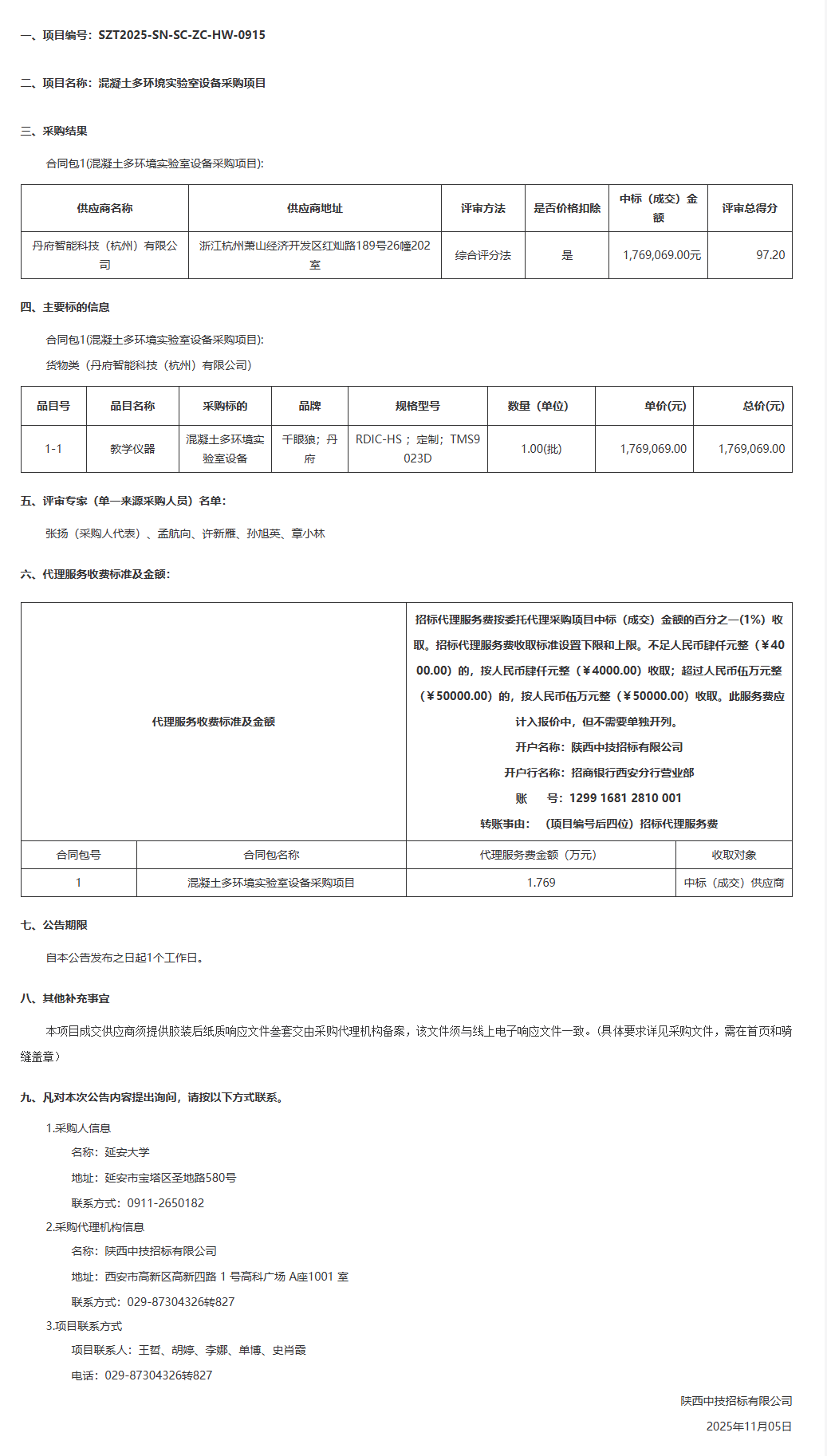延安大学混凝土多环境实验室设备采购项目中标(成交)结果公告