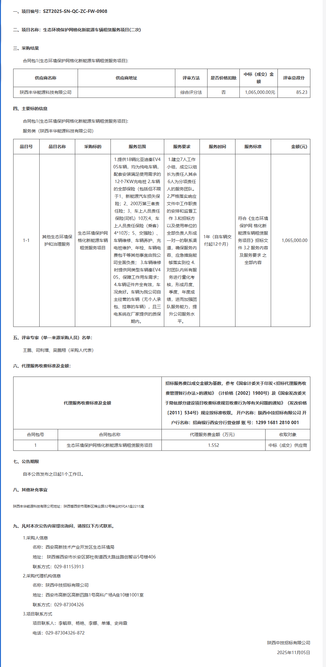 西安高新技术产业开发区生态环境局生态环境保护网格化新能源车辆租赁服务项目(二次)中标(成交)结果公告