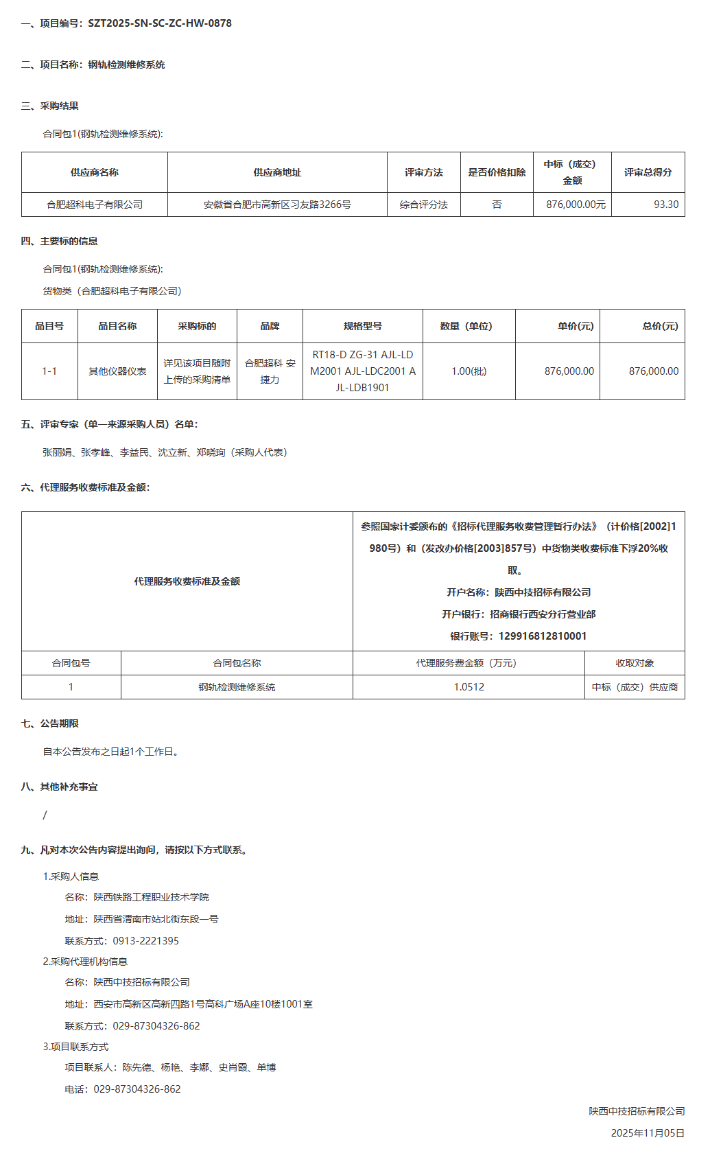 陕西铁路工程职业技术学院钢轨检测维修系统中标(成交)结果公告