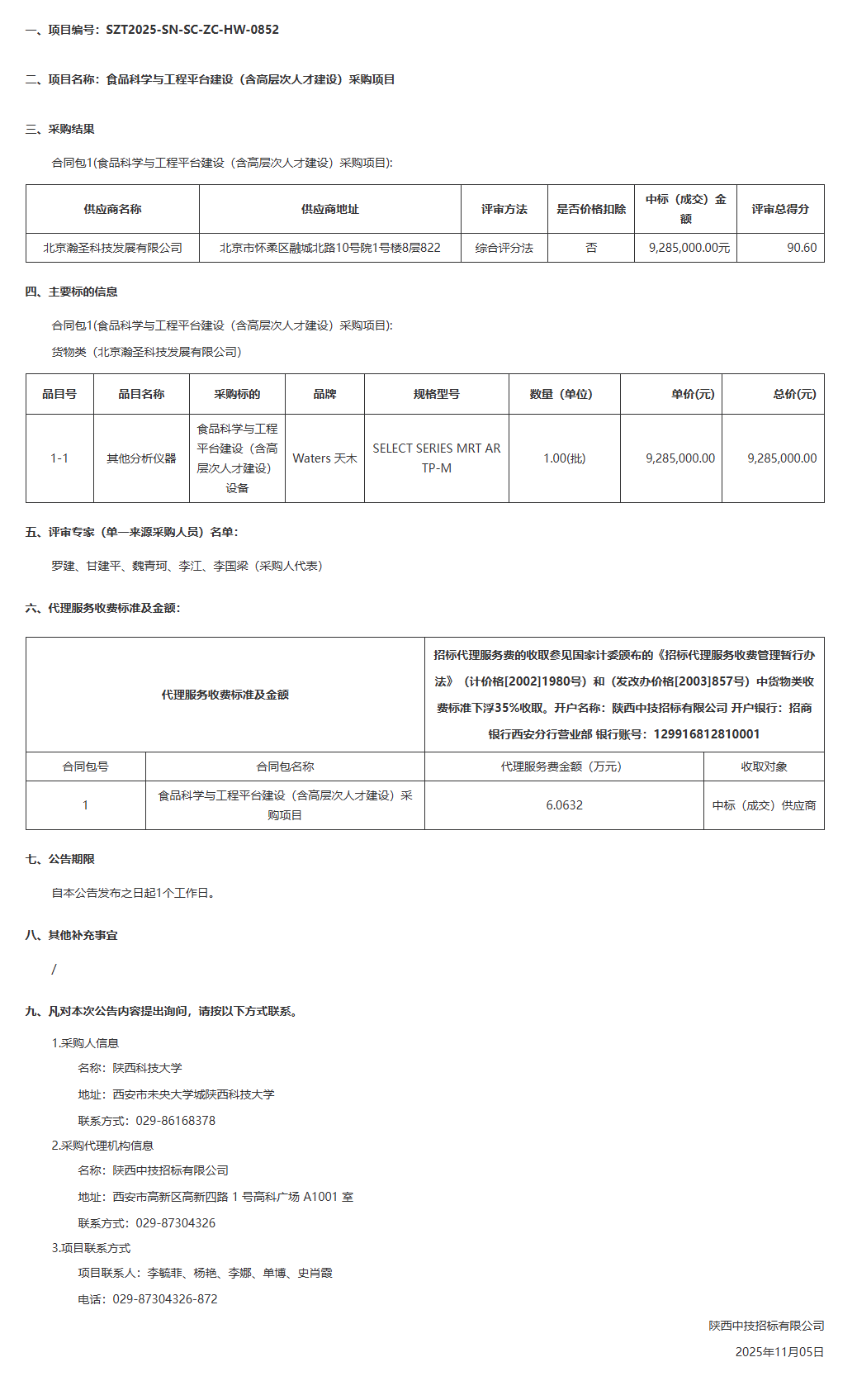 陕西科技大学食品科学与工程平台建设(含高层次人才建设)采购项目中标(成交)结果公告