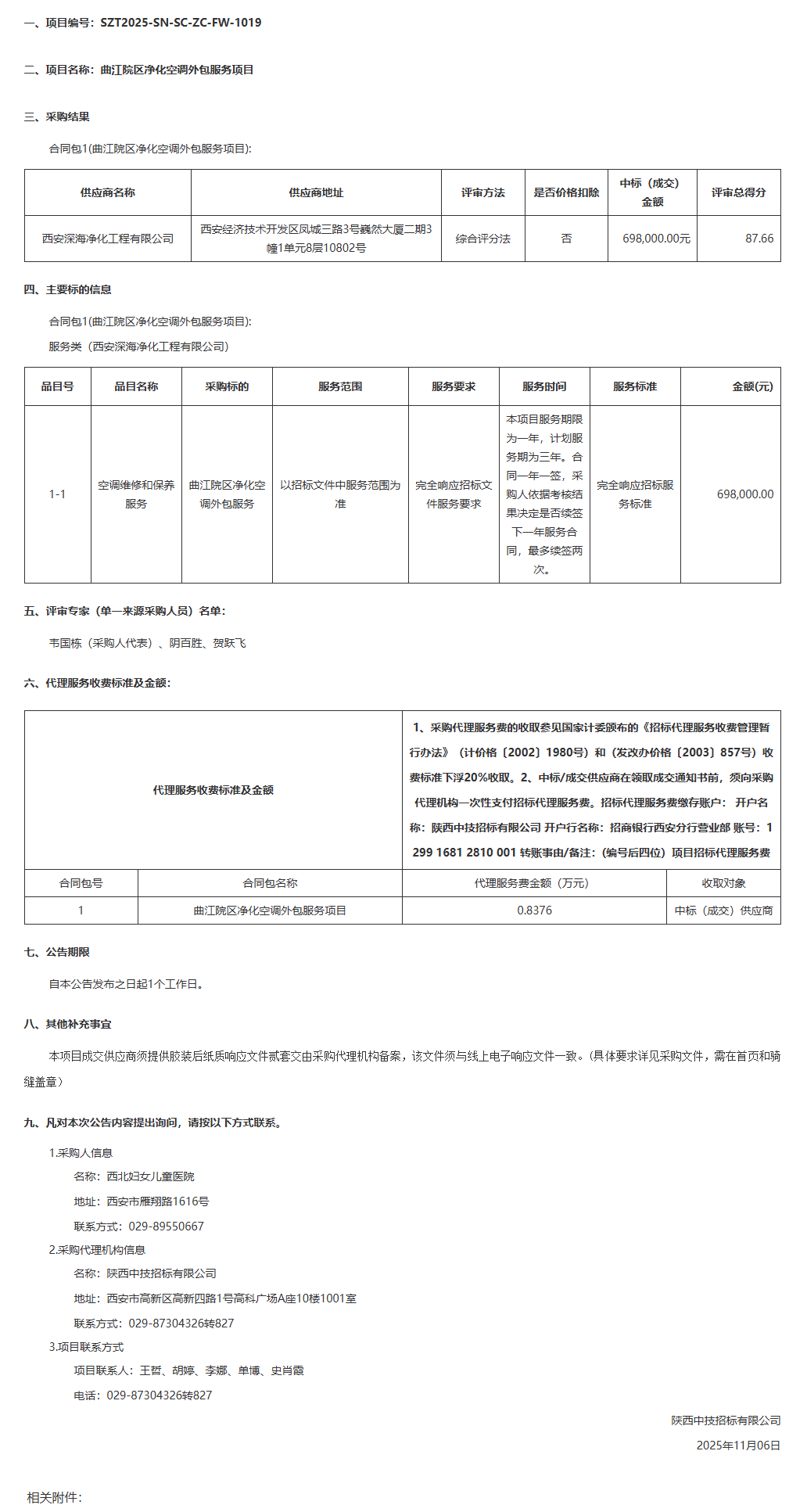 西北妇女儿童医院曲江院区净化空调外包服务项目中标(成交)结果公告