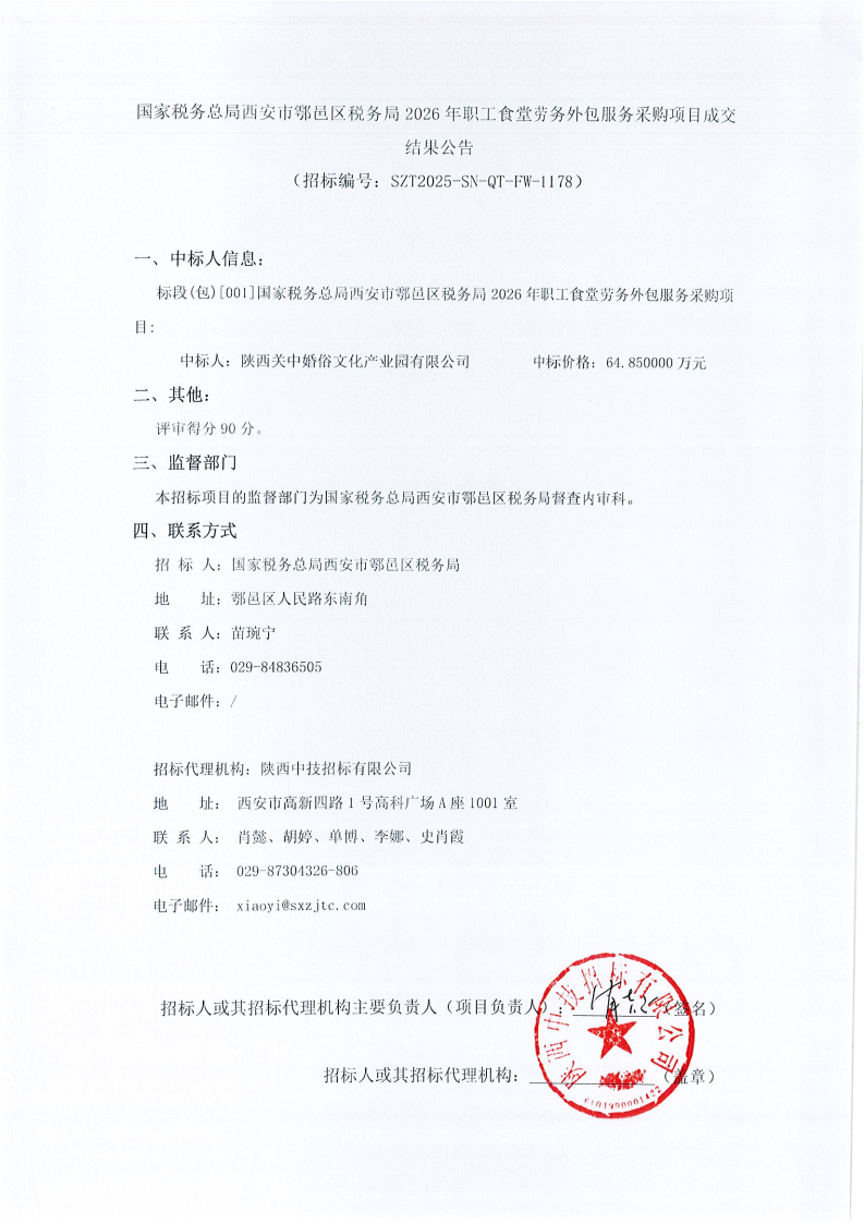 国家税务总局西安市鄠邑区税务局2026年职工食堂劳务外包服务采购项目成交结果公告