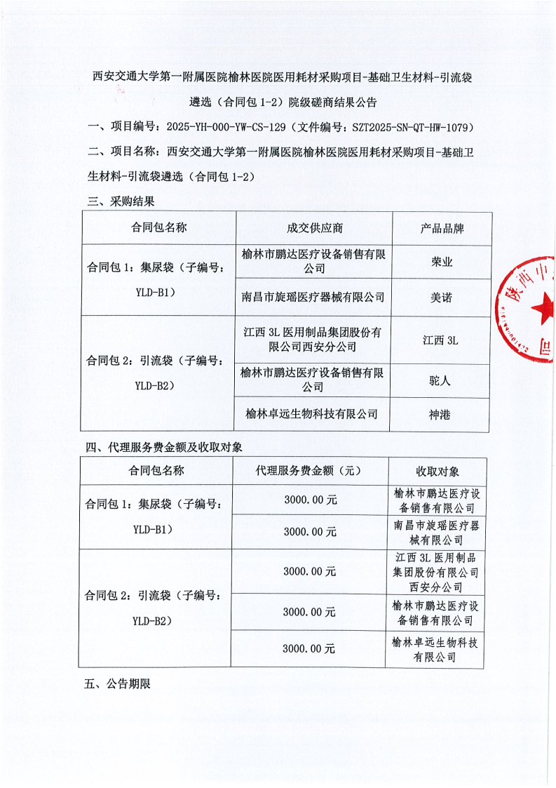 西安交通大学第一附属医院榆林医院医用耗材采购项目-基础卫生材料-引流袋遴选(合同包1-2)院级磋商结果公告