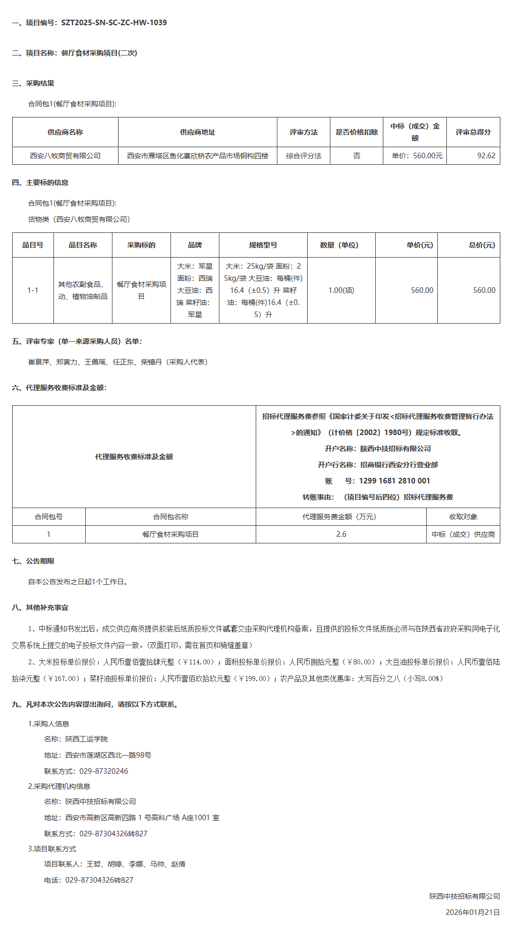 陕西工运学院餐厅食材采购项目(二次)中标(成交)结果公告