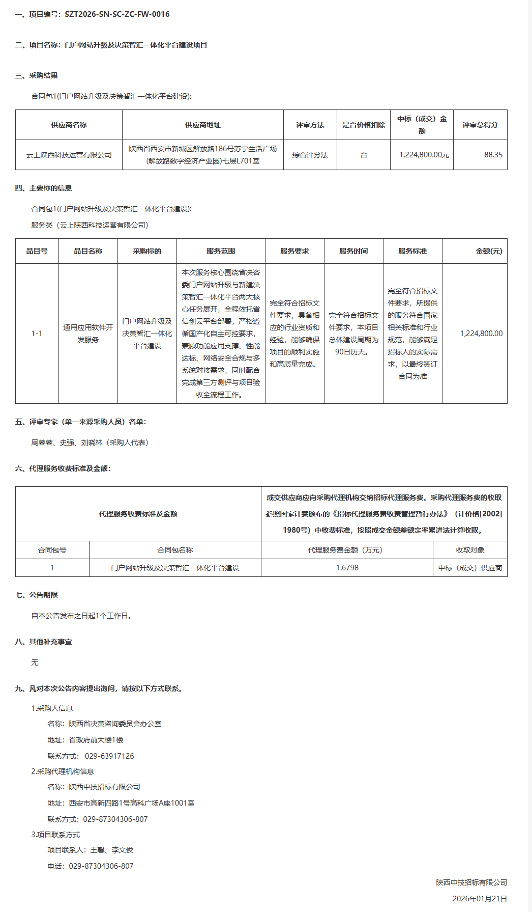 陕西省决策咨询委员会办公室门户网站升级及决策智汇一体化平台建设项目中标(成交)结果公告