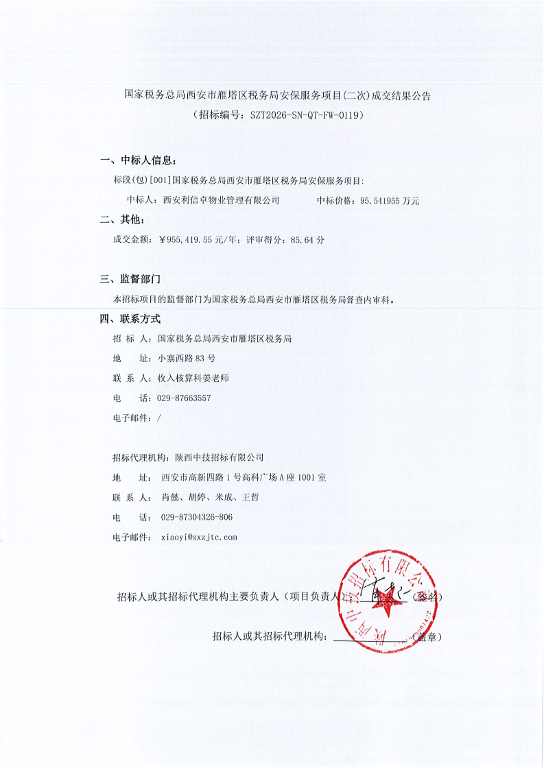 国家税务总局西安市雁塔区税务局安保服务项目(二次)成交结果公告