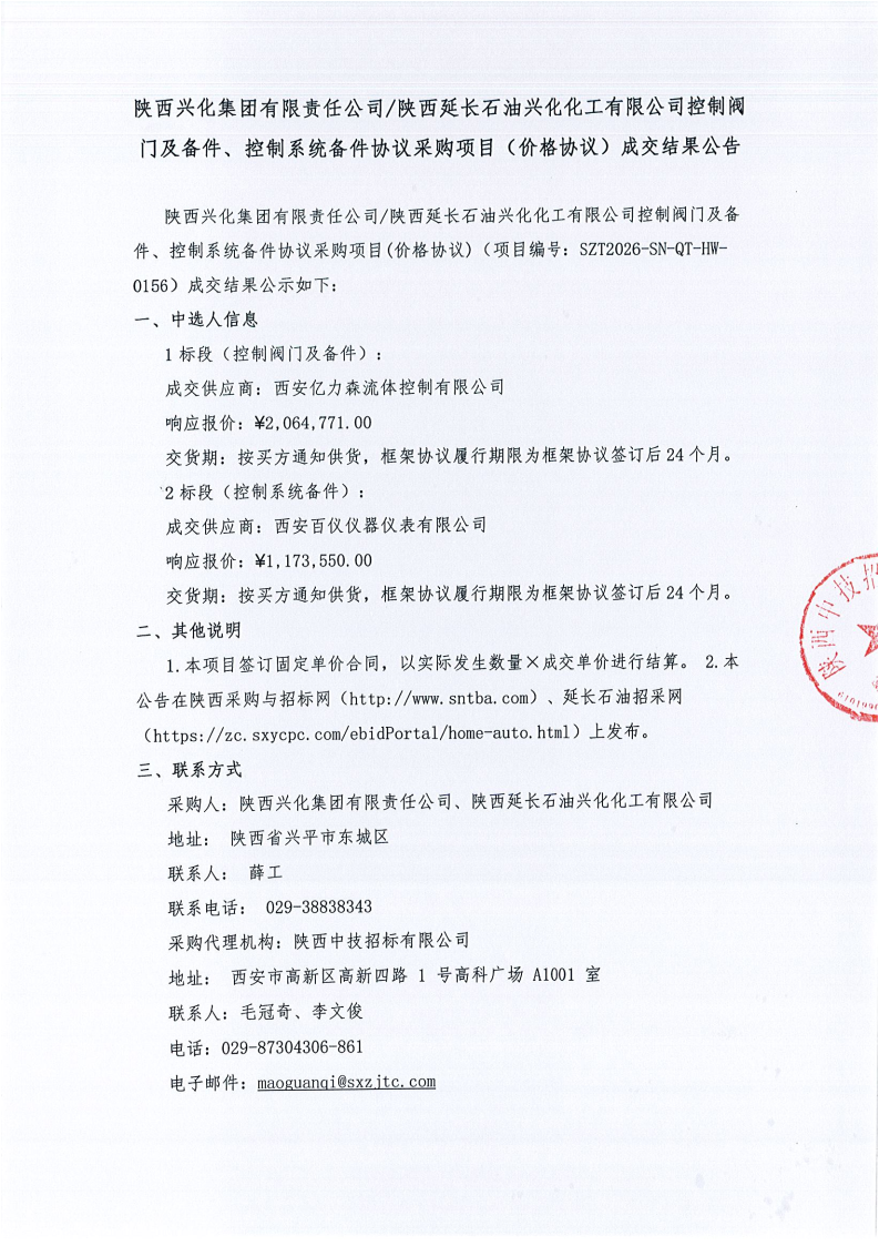 陕西兴化集团有限责任公司、陕西延长石油兴化化工有限公司控制阀门及备件、控制系统备件协议采购项目(价格协议)成交结果公告