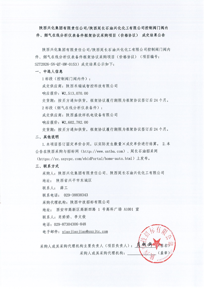 陕西兴化集团有限责任公司、陕西延长石油兴化化工有限公司控制阀门阀内件、烟气在线分析仪表备件框架协议采购项目(价格协议)成交结果公告