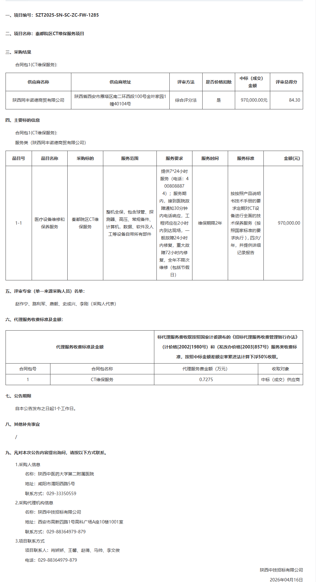 陕西中医药大学第二附属医院秦都院区CT维保服务项目中标结果公告