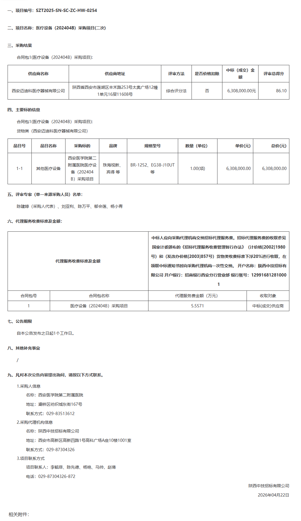 西安医学院第二附属医院医疗设备(202404B)采购项目(二次)中标(成交)结果公告