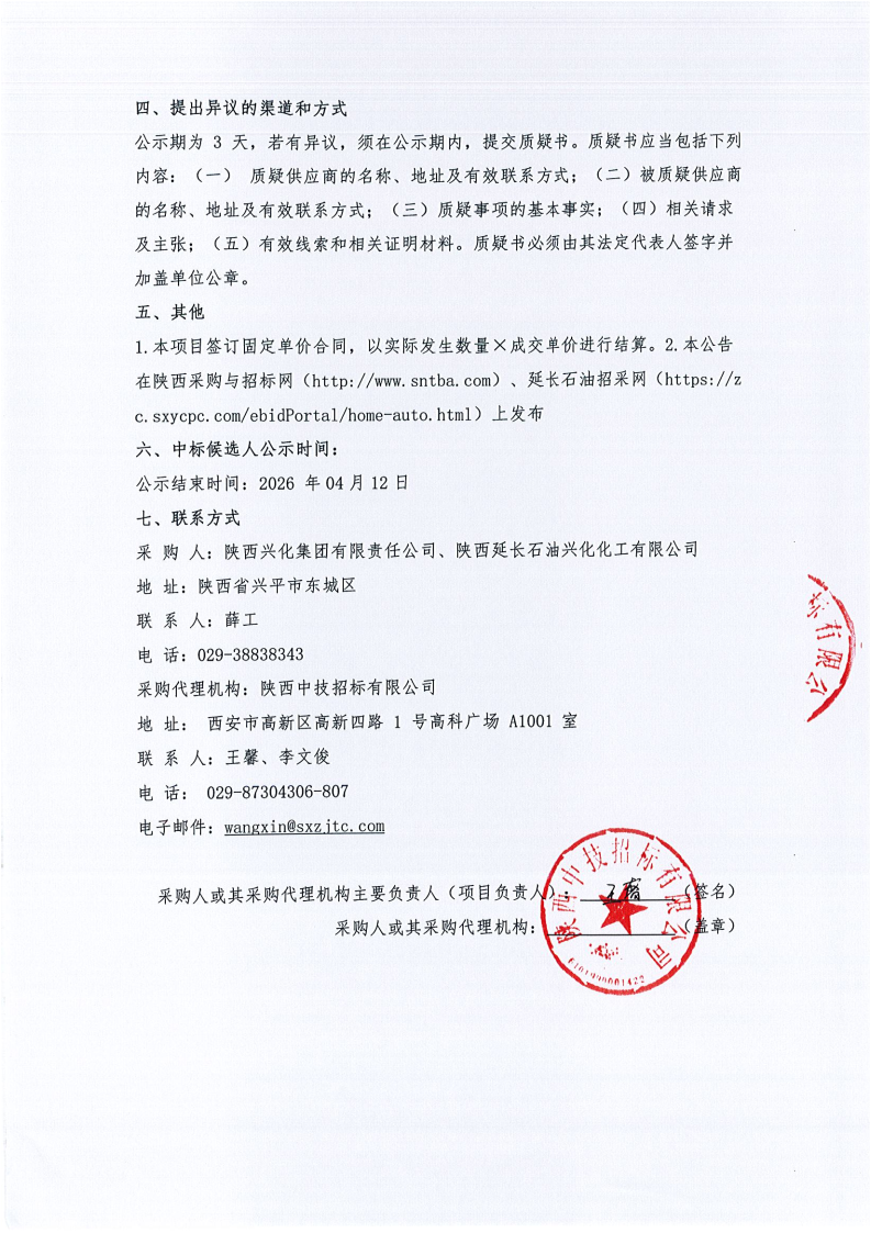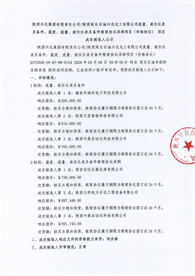 陕西兴化集团有限责任公司、陕西延长石油兴化化工有限公司流量、液位仪表及备件,温度、流量、液位仪表及备件框架协议采购项目(价格协议)项目成交候选人公示